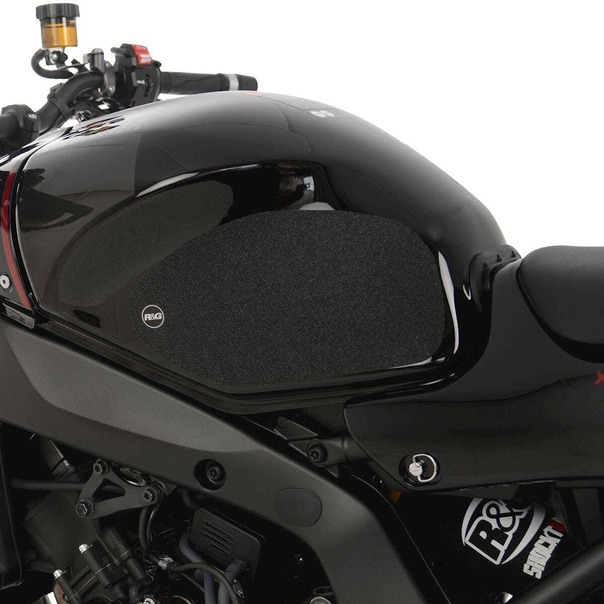 R&G Tank Traction Grip kits are available for many different bike styles and brands, with new applications released regularly. The unique R&G Traction Grip texture was specifically designed to be both soft and durable, providing the rider with the grip and feel he/she needs to assist in better bike control, enabling the rider to maintain a stable body position while cornering and braking, whilst also relieving fatigue and providing the rider with complete confidence allowing him/her to fully focus on the road (or track) ahead instead of slipping and sliding on the tank. Each Tank Traction Grip kit is supplied with precision pre-cut adhesive pieces, designed to fit the intended bike, typically in either 2, 4 or 6 pieces (in total) depending on the shape of the tank and adjoining fairing. The high-strength adhesive backing ensures a highly durable product that will stay exactly where you put it, as well as not affecting or damaging paintwork. Each R&G Tank Traction Grip kit is available in black and ultra-clear finishes to blend into your bike's paintwork or stand out, depending on your preference. R&G Tank Traction Grips work in both wet and dry conditions and is equally at home on the track as it is on the commute home! Please note: R&G Tank Traction Grips now come with a 25mm diameter stick on emblem. This 2-piece R&G Tank Traction Grip kit has been specially designed for the Yamaha XSR900 '22- model. Made in the UK.