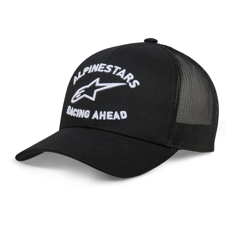 Curved bill trucker cap with mesh back and 3D embroidered front logo.