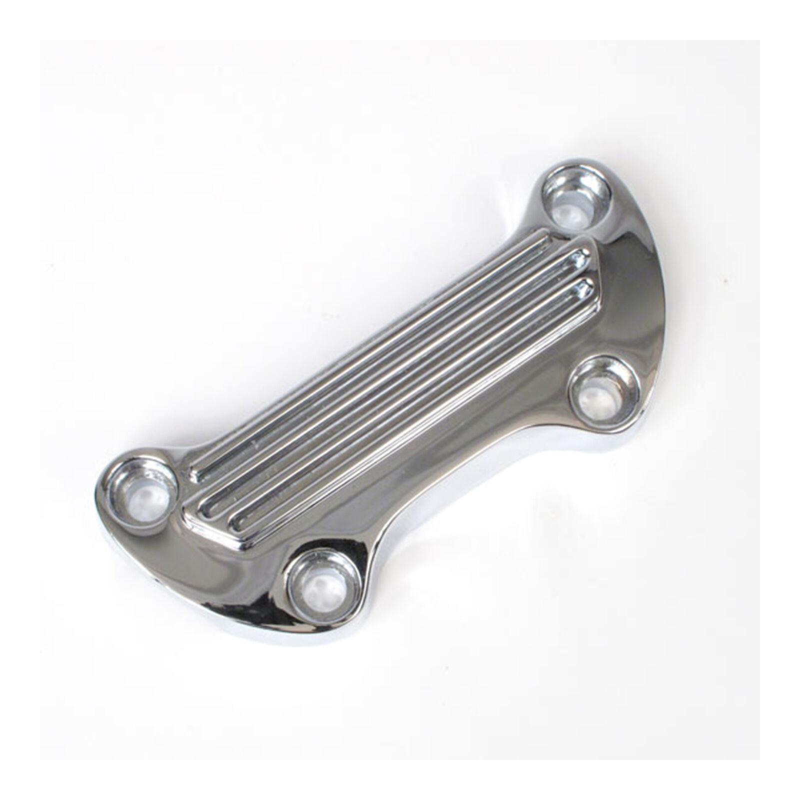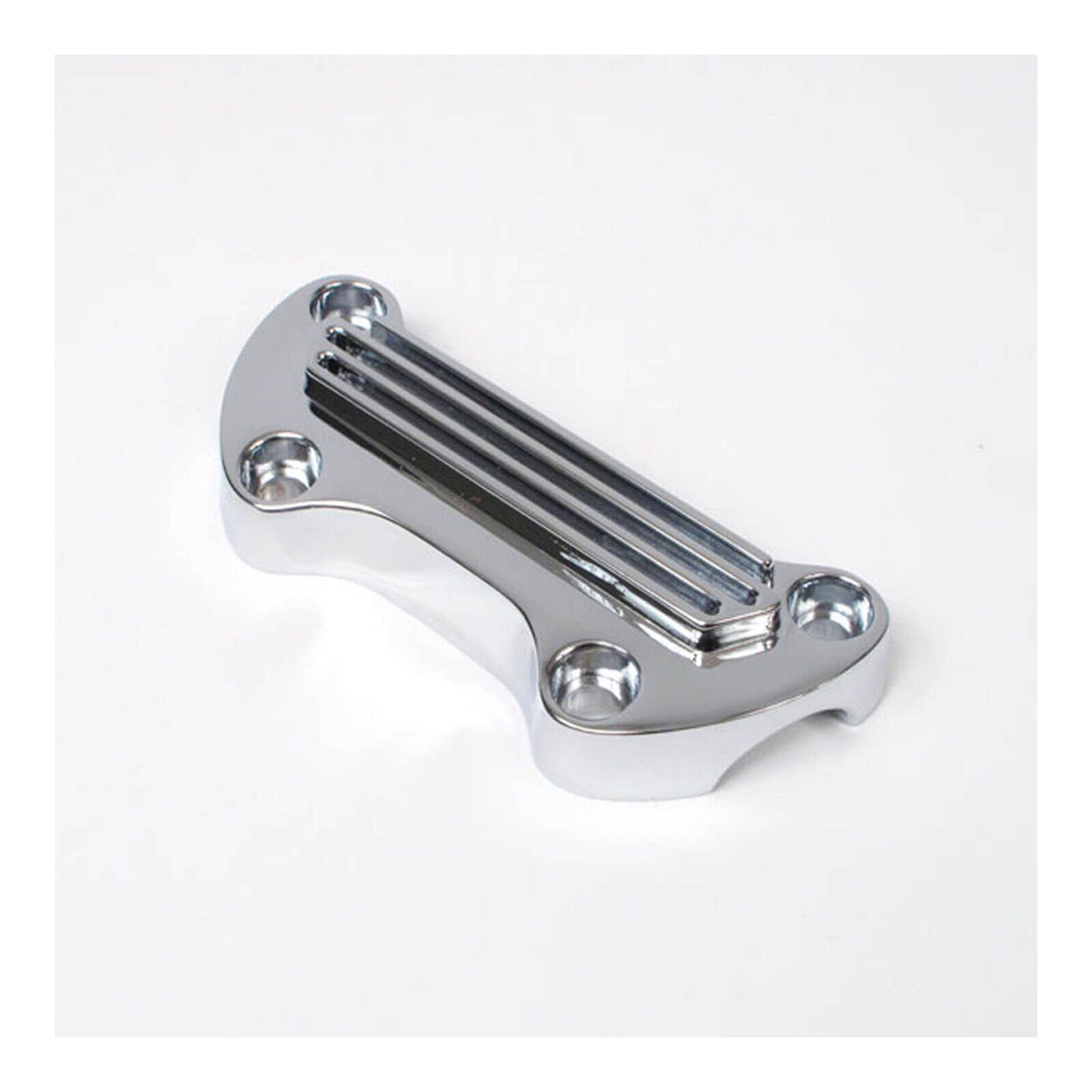The Whites 1-Piece Finned Top Bar Clamp is the perfect addition to your cafe racer or bobber project or an upgrade for your existing ride. Constructed from chrome plated steel for excellent strength durability and corrosion resistance while providing a show chrome shine. The clamp is manufactured with countersunk bolt holes to improve the look of your handlebar set up and is compatible with 1 handlebars.