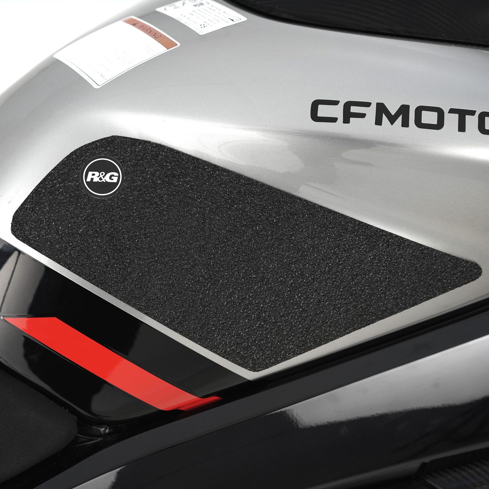 R&G Tank Traction Grip kits are available for many different bike styles and brands & with new applications released regularly. The unique R&G Tank Traction Grip texture was specifically designed to be both soft and durable & providing the rider with the grip and feel he/she needs to assist in better bike control & enabling the rider to maintain a stable body position while cornering and braking & whilst also relieving fatigue and providing the rider with complete confidence allowing him/her to fully focus on the road (or track) ahead instead of slipping and sliding on the tank. Each Tank Traction Grip kit is supplied with precision pre-cut adhesive pieces & designed to fit the intended bike & typically in either 2 & 4 or 6 pieces (in total) depending on the shape of the tank and adjoining fairing. The high-strength adhesive backing ensures a highly durable product that will stay exactly where you put it & as well as not affecting or damaging paintwork. Each R&G Tank Traction Grip kit is available in black and ultra-clear finishes to blend into your bike & paintwork or stand out & depending on your preference. R&G Eazi-Grip ™ works in both wet and dry conditions and is equally at home on the track as it is on the commute home!This 2-piece R&G Tank Traction Grip kithas been specially designed for the CFMoto 300NK & 21-