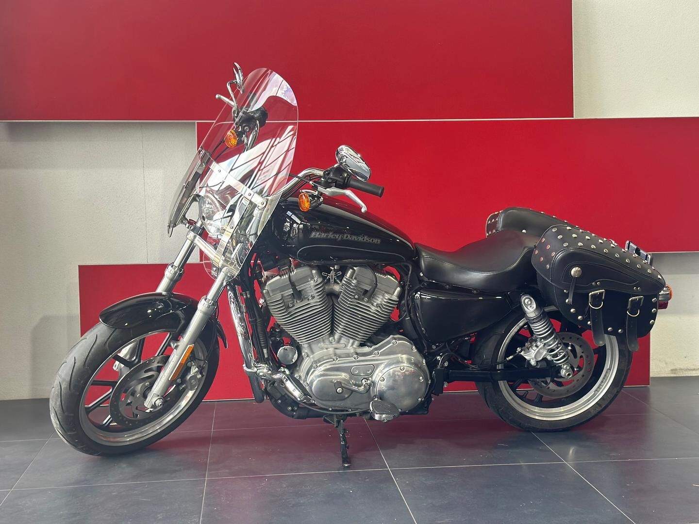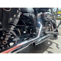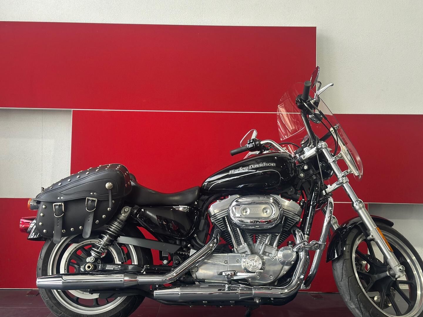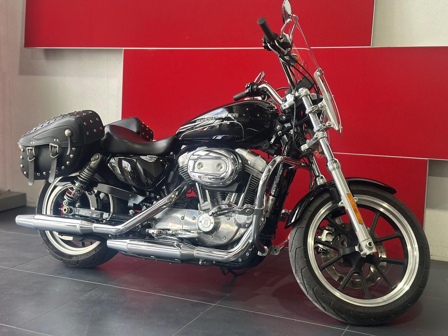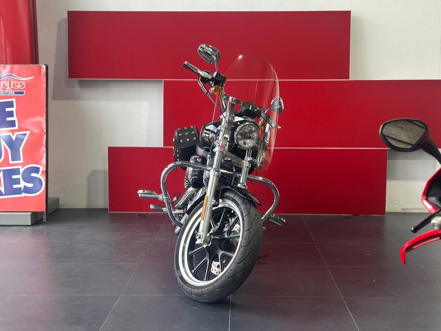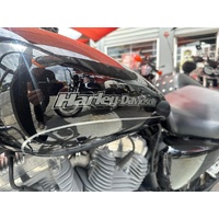 This particular SuperLow 883 comes fitted with a well-appointed touring screen, chrome crash bars, saddlebags, and highway pegs—enhancements that make it a fantastic option for longer rides and weekend getaways. The touring screen adds wind protection for highway cruising, while the saddlebags offer practical storage without compromising the bike’s sleek lines. Highway pegs and crash bars not only increase comfort but also enhance safety and control during extended rides. Altogether, this SuperLow is a stylish, comfortable, and well-equipped Harley that’s ready for the open road.