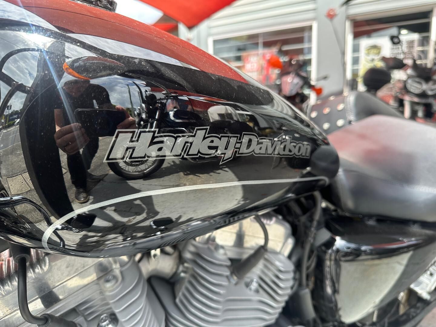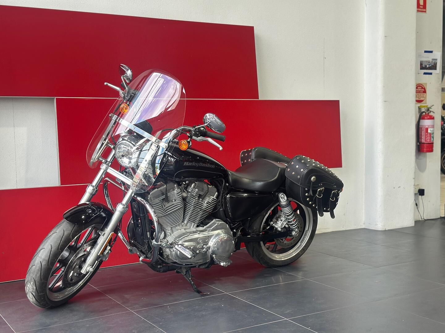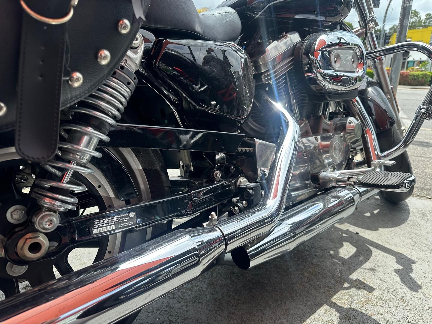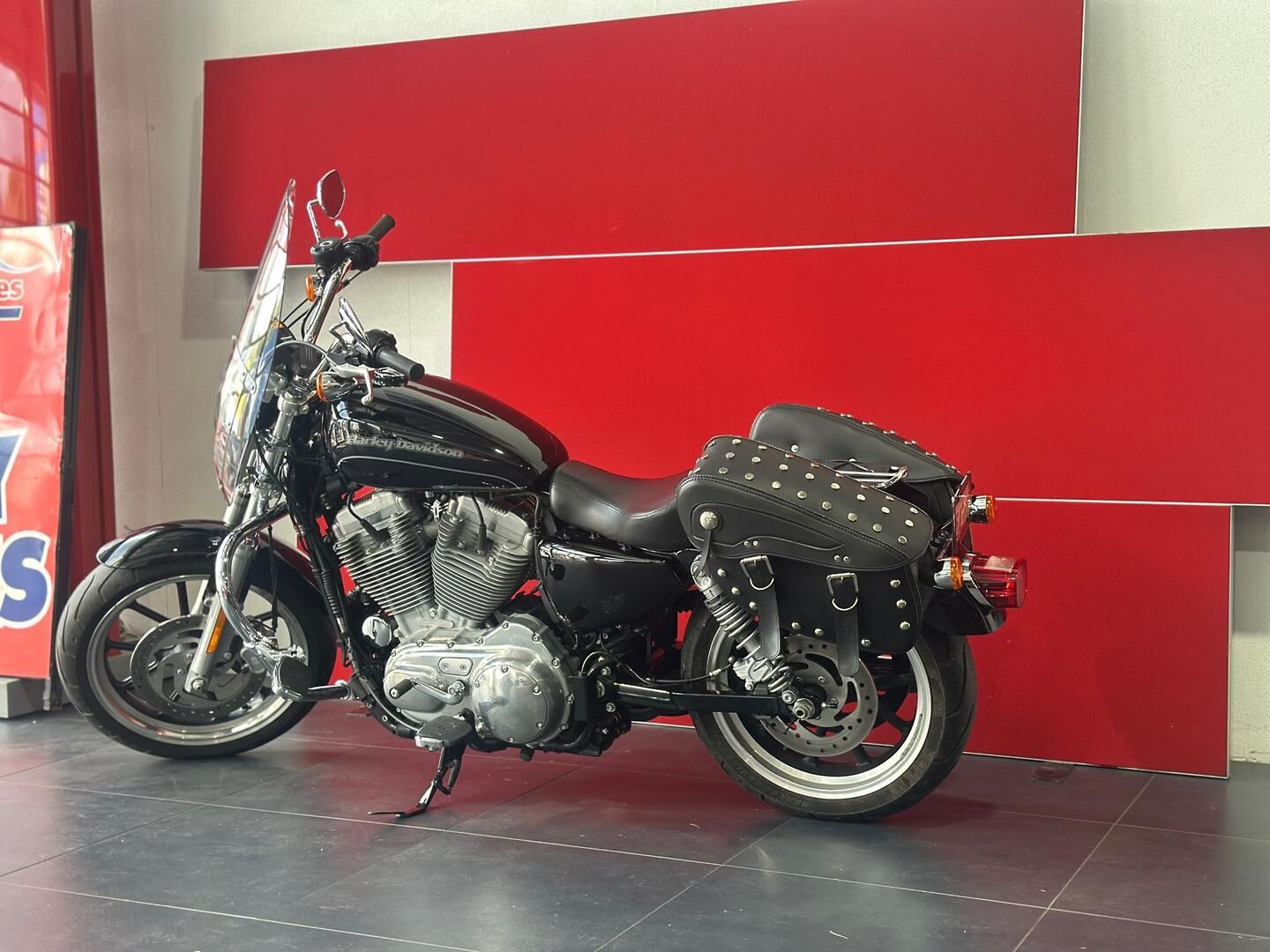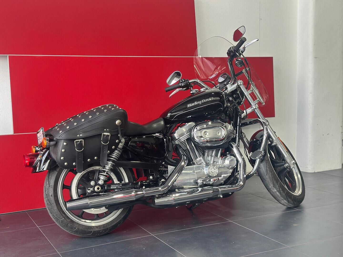 This particular SuperLow 883 comes fitted with a well-appointed touring screen, chrome crash bars, saddlebags, and highway pegs—enhancements that make it a fantastic option for longer rides and weekend getaways. The touring screen adds wind protection for highway cruising, while the saddlebags offer practical storage without compromising the bike’s sleek lines. Highway pegs and crash bars not only increase comfort but also enhance safety and control during extended rides. Altogether, this SuperLow is a stylish, comfortable, and well-equipped Harley that’s ready for the open road.