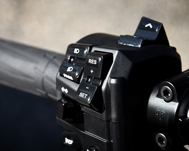 The FJR1300AE benefits from a new easy-to-operate cruise control system, which has been designed to make long-distance touring more relaxing and enjoyable. The system functions in between 50 km/h and 180 km/h, and is operated by two switches located on the left handlebar assembly.