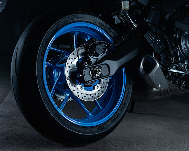 Contributing to a lighter and more agile MT-07, the wheels have been manufactured using Yamaha’s patented SpinForged technology. This allows for a thinner and lighter casting, without compromising strength. Dunlop Sportmax Q5A tyres have been specially chosen as OE equipment for MT-07, being famed for their light handling and all-round capabilities.