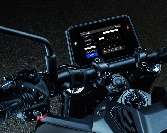 Customise your riding experience via the Yamaha Ride Control (YRC) settings, which allow you to select engine power characteristics and the level of electronic intervention to suit your preferences and road conditions. Three integrated riding modes are programmed with factory settings to suit different situations: SPORT, STREET and RAIN; but you can also create two custom programmes to suit your individual preferences. The YRC settings can be customised directly in the dashboard menu or on your smartphone via the Y-Connect app.