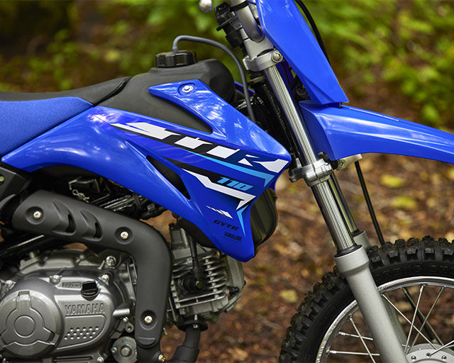 Check out the TT-R110E's bodywork and it's clear that the radical lines of this stylish 4-stroke have been inspired by our MXGP-winning YZ race bikes. Finished in our world-famous racing-blue colour scheme, the fenders and fuel tank panels are made from ultra-tough polypropylene for minimum weight and maximum strength.