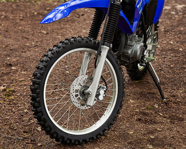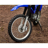 Front 220mm disc and 130mm rear drum brakes for powerful, confident stops. Full-size 21-inch front and 18-inch rear aluminium wheels keep unsprung weight down, while knobby tires provide motocross-spec grip.
