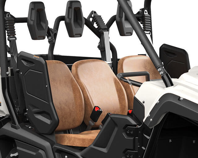 This true 3-passenger machine achieves driver and passenger comfort with a handhold, padded head rests, and 3-point seat belts for all riders. Extensive noise and vibration reduction measures provide a smooth and quiet ride. The superior seating position, adjustable driver’s seat, and an offset middle seat all provide unmatched comfort that riders will appreciate.
