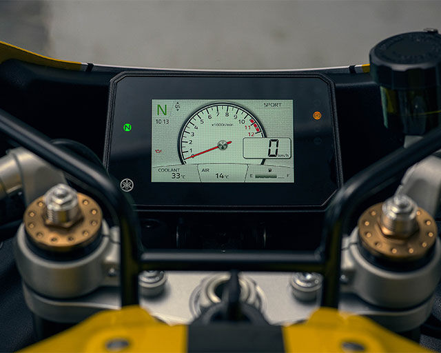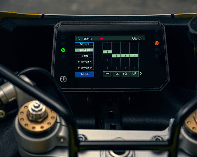 The advanced, R1-derived 6-axis IMU controls the extensive suite of rider aids, including Lean Sensitive Traction Control and ABS, Slide Control, and front wheel Lift Control System among more. Yamaha Ride Control allows you to select the engine power characteristic and level of intervention from the lean sensitive rider aids to suit your preferences and road conditions. Three pre-set integrated riding modes, ‘SPORT’, ‘STREET’ and ‘RAIN’ featuring factory settings with different intervention levels to suit different conditions are complemented tow manually adjustable ‘CUSTOM’ settings.