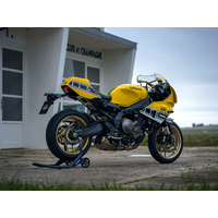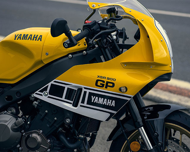 The XSR900 GP features an upper cowling reminiscent of the 1980s ‘Golden Era’ of Grand Prix racing. The cowling, combined with separate knuckle guards not only give off vibes of the YZR500, but the added aerodynamic effect increases top speed and acceleration. A colour-matched seat cover on the passenger seat completes the racer look with a boxy 1980s style rear end.