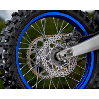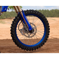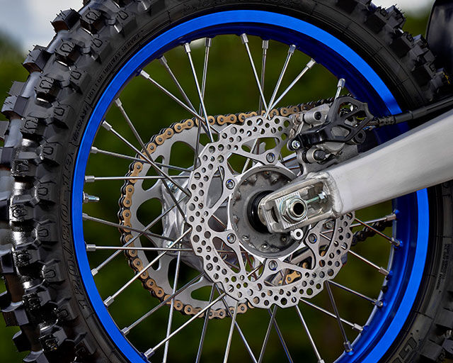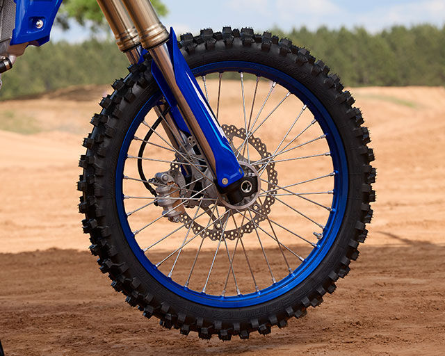 Careful computer-aided design of each wheel’s cross-sectional profile shaves weight without sacrificing durability. The YZ450F's rear wheel comes laced with a three-cross-spoke pattern for improved impact absorption and rider feel.