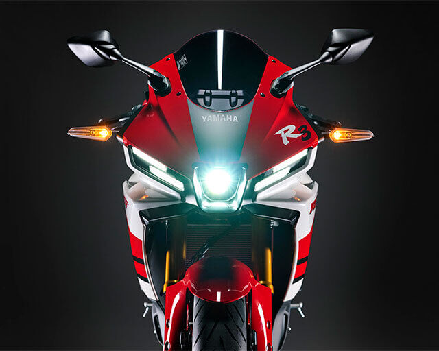 Inspired by the flowing aerodynamics of Yamaha's YZR-M1 MotoGP® race bike, the YZF-R3's distinctive R-series pedigree is recognisable at a glance with its aggressive front fairing, sleek side panels and a sporty tail section with signature R-series tail wing.